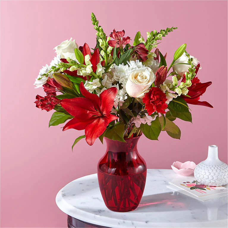 The perfect date isn’t complete without classic rose blossoms, romantic white snapdragons, red carnations, and more dreamy flowers to show your affection. Please Note: The bouquet pictured reflects our original design for this product. While we always try to follow the color palette, we may replace stems to deliver the freshest bouquet possible, and we may sometimes need to use a different vase.